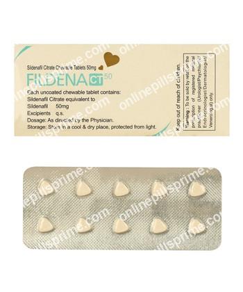 Fildena CT is a chewable tablet used to treat erectile dysfunction (ED) in men by enhancing blood flow to the penis during sexual stimulation. It contains Sildenafil Citrate, a PDE5 inhibitor that helps achieve and maintain a firm erection. Its chewable form allows for faster onset of action and is convenient for those who have difficulty swallowing traditional tablets. It improves sexual performance and supports a more satisfying intimate experience.